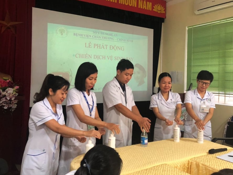 Hưởng ứng chiến dịch “Phòng ngừa nhiễm khuẩn do chăm sóc y tế - chính từ nơi bàn tay bạn” do Tổ chức Y tế Thế giới (WHO) phát động, ngày hôm qua, 7/11/2019, Khoa kiểm soát nhiễm khuẩn - Bệnh viện Chấn thương chỉnh hình Nghệ An đã tổ chức lễ phát động chiến dịch vệ sinh tay tới toàn thể nhân viên y tế. Toàn thể cán bộ công nhân viên Bệnh viện đã cam kết cùng nhau tuân thủ và thực hiện theo “5 thời điểm cần rửa tay đối với nhân viên y tế“ và “quy trình rửa tay 6 bước của Bộ y tế” để cùng chung tay chống lại nguy cơ nhiễm khuẩn.